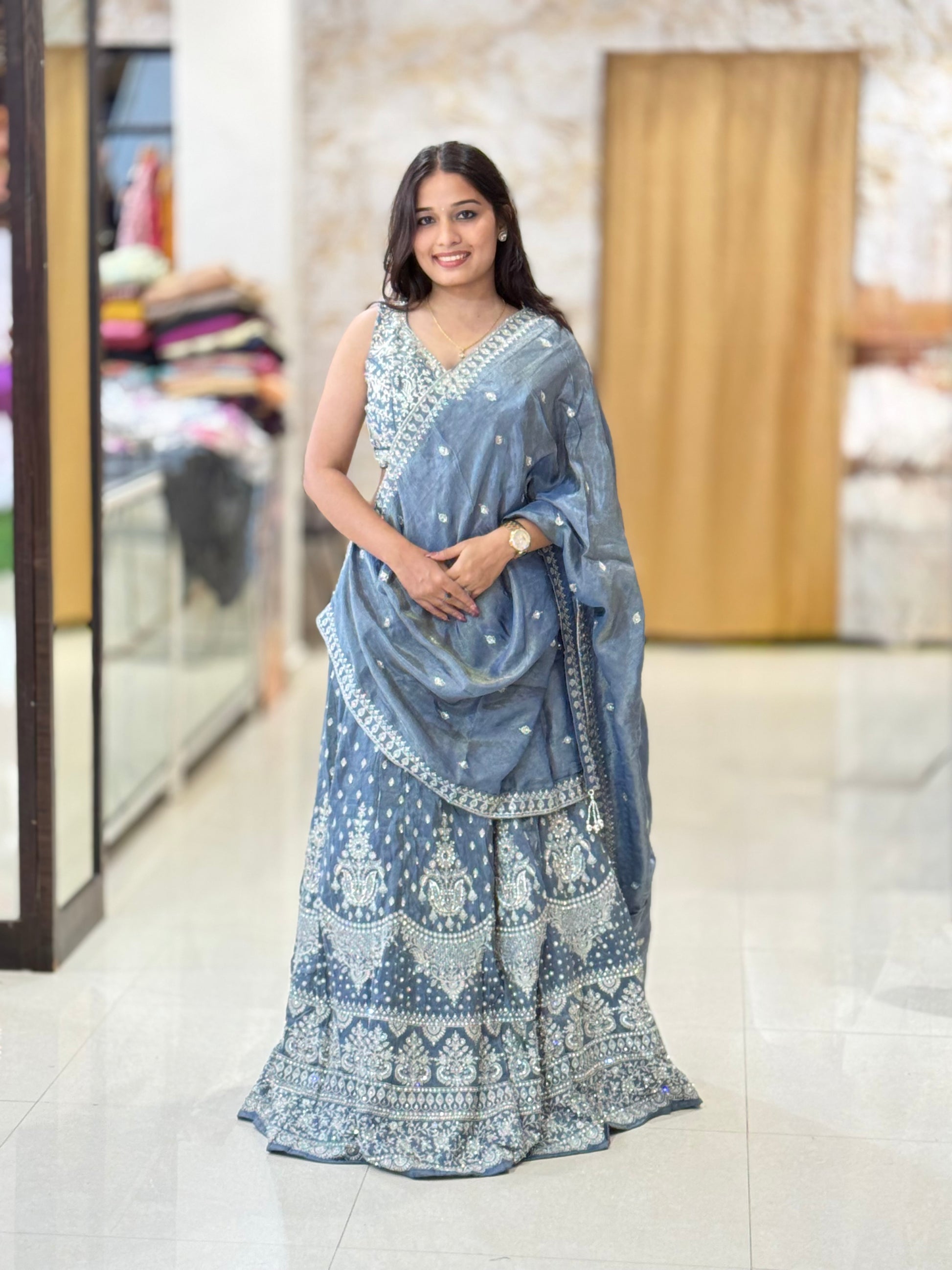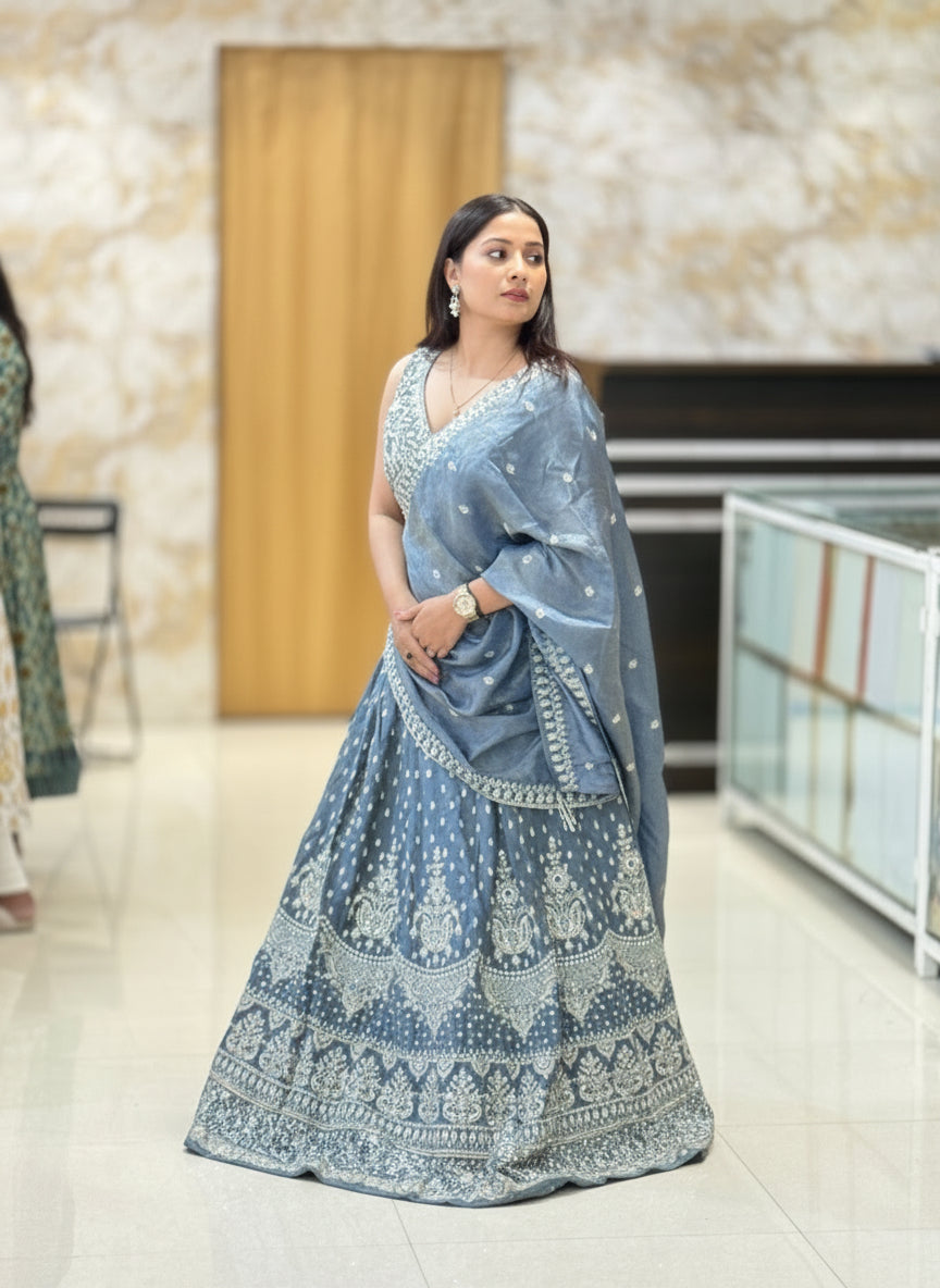 This stunning grey lehenga with exquisite detailing on the blouse and lehenga comes with a belt, elevating its overall look and making it a perfect choice for your cocktail and reception events. Its gorgeous design will surely make you stand out and feel confident on your special occasions.
